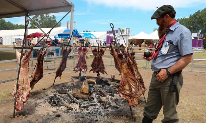 Preparado lentamente sobre brasas de madera nativa, el cordero desarrolla una piel crocante y una carne jugosa y perfumada con humo. Se sirve en porciones generosas acompañadas de papas asadas, ensalada de repollo y pebre de ají verde.